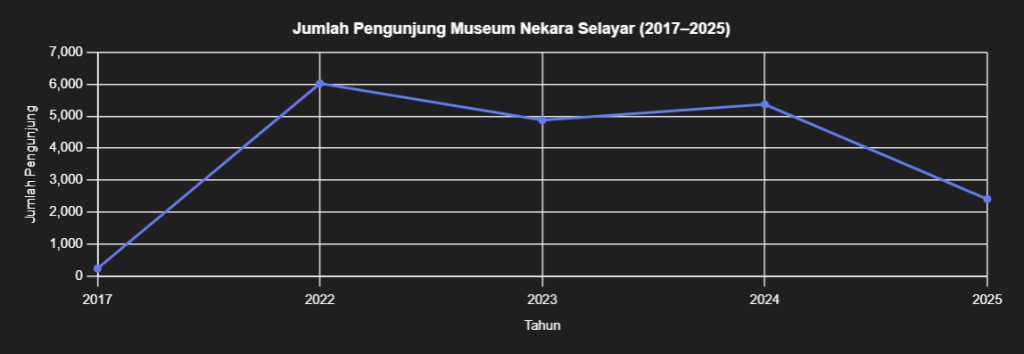 Pada 2023 dan 2024, grafik menunjukkan angka yang relatif stabil—sekitar 4.800 hingga 5.300 pengunjung. Ini fase ketika museum mulai dikenal, tetapi belum sepenuhnya dibutuhkan. Pengunjung datang karena rekomendasi sekolah, teman, atau media sosial.